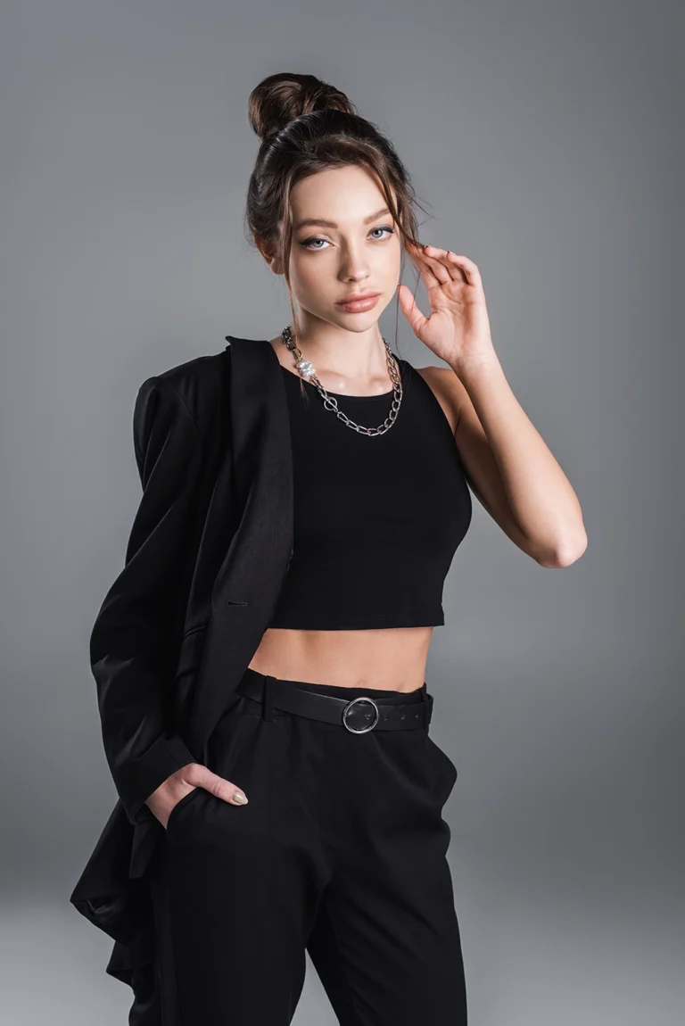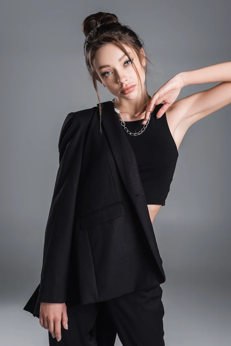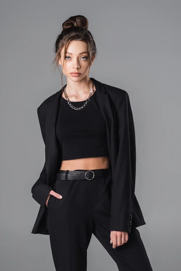 The Noir Blazer features a structured fit and clean lines, offering a sleek and versatile look for any occasion.